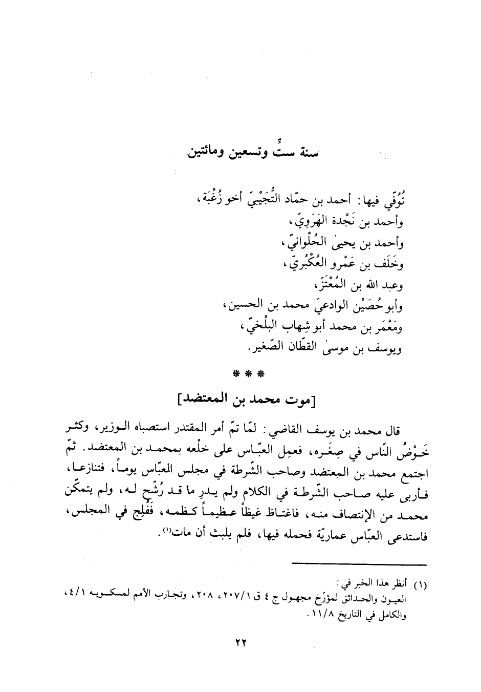 العيون والحدائق لمؤرّخ مجهول ج 4 ق 1/ 207، 208، وتجارب الأمم لمسكويه 1/ 4، والكامل في التاريخ 8/ 11.
