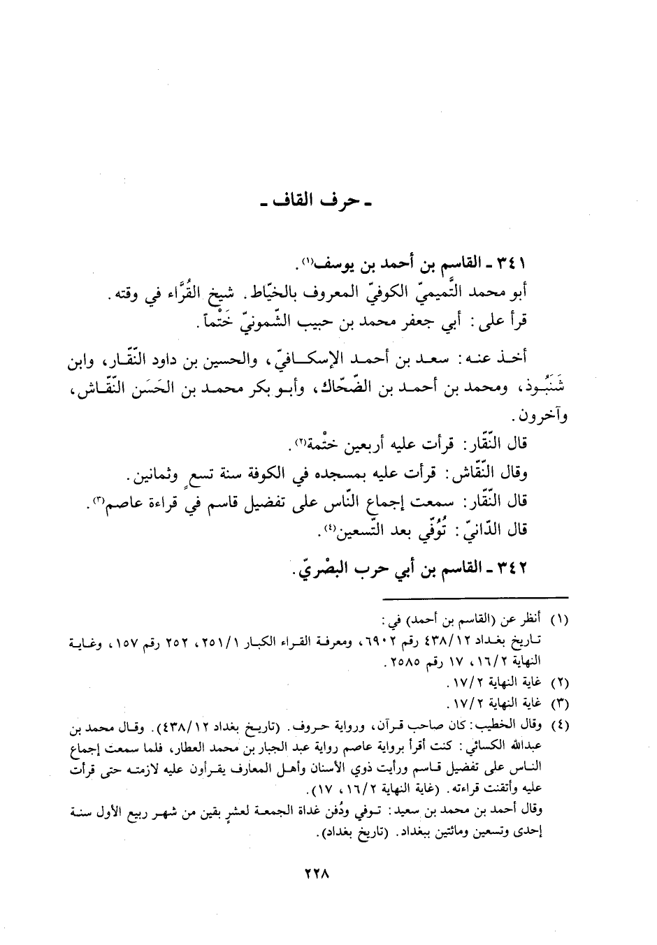 [4] وقال الخطيب: كان صاحب قرآن، ورواية حروف. (تاريخ بغداد 12/ 438) . وقال محمد بن عبد الله الكسائي: كنت أقرأ برواية عاصم رواية عبد الجبار بن محمد العطار، فلما سمعت إجماع الناس على تفضيل قاسم ورأيت ذوي الأسنان وأهل المعارف يقرءون عليه لازمته حتى قرأت عليه وأتقنت قراءته. (غاية النهاية 2/ 16، 17) .