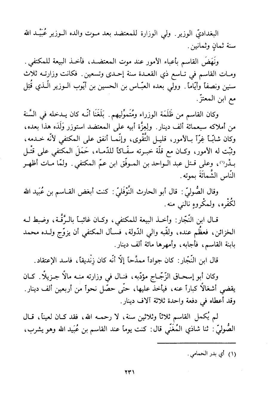 وكان القاسم من ظَلَمَة الوزراء ومُتَموِّليهم. بَلَغَنَا أنه كان يدخله في السّنة من أملاكه سبعمائة ألف دينار. ولعِزَّة أبيه على المعتضد استوزر وَلَدَه هذا بعده، وكان شابًا غِرًّا بالأمور، قليل التَّقْوَى، وإنما أنفق على المكتفي لأنّه خدمه، وثبّت له الأمور، وكان مع قلّة خبرته سفّاكًا للدّماء، حَمَلَ المكتفي على قتْل بَدْر [1] ، وعلى قتل عبد الواحد بن الموفّق ابن عم المكتفي. ولمّا مات أظهر النّاس الشَّماتَةَ بموته.