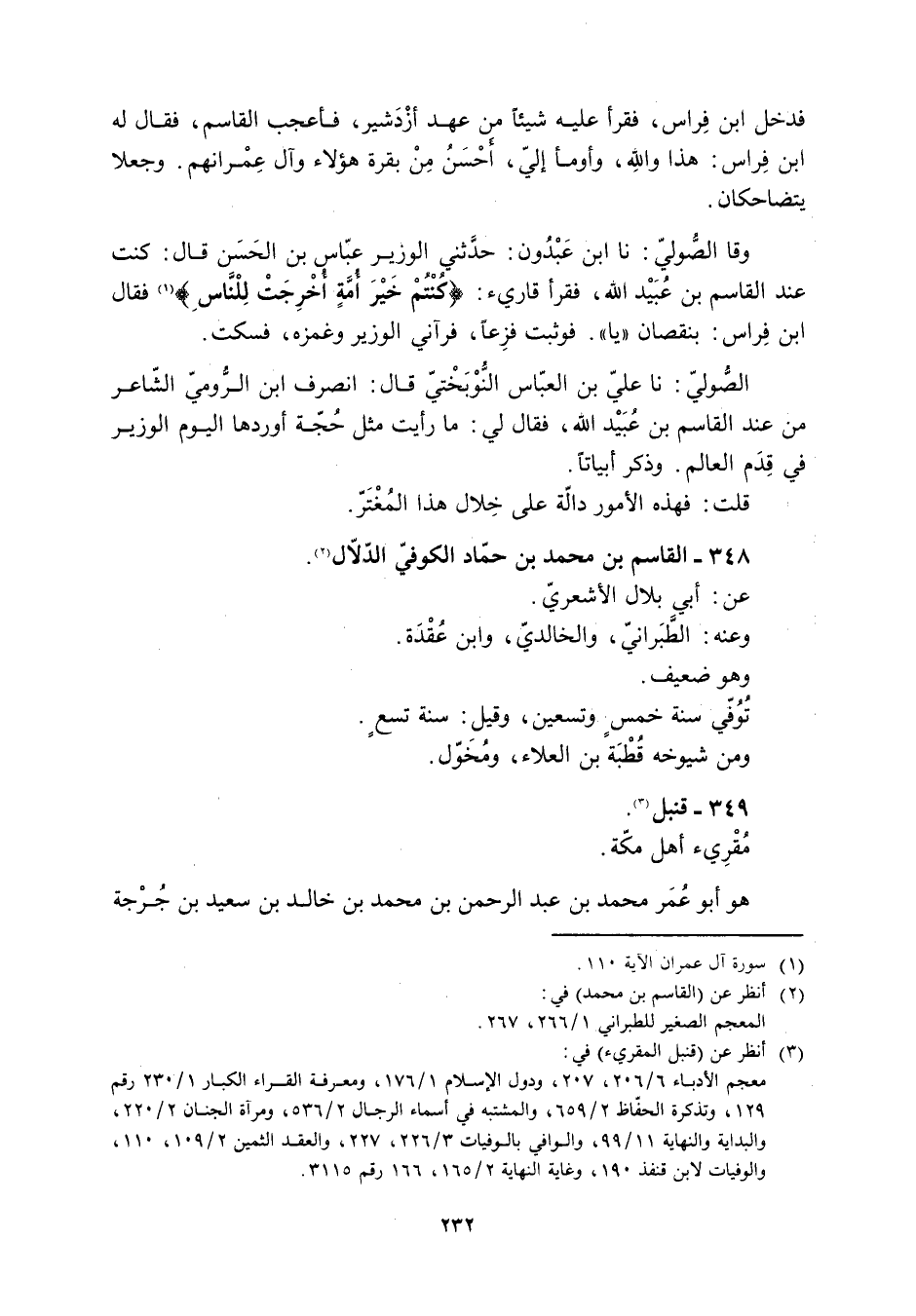وقال الصّوليّ: نا ابن عَبْدُون: حدَّثني الوزير عبّاس بن الحَسَن قَالَ: كنت عند القاسم بن عُبَيْد الله، فقرأ قارئ: كُنْتُمْ خَيْرَ أُمَّةٍ أُخْرِجَتْ لِلنَّاسِ 3: 110 [1] فَقَالَ ابن فِراس: بنقصان «يا» . فوثبت فزِعًا، فرآني الوزير وغَمزه، فسكت.