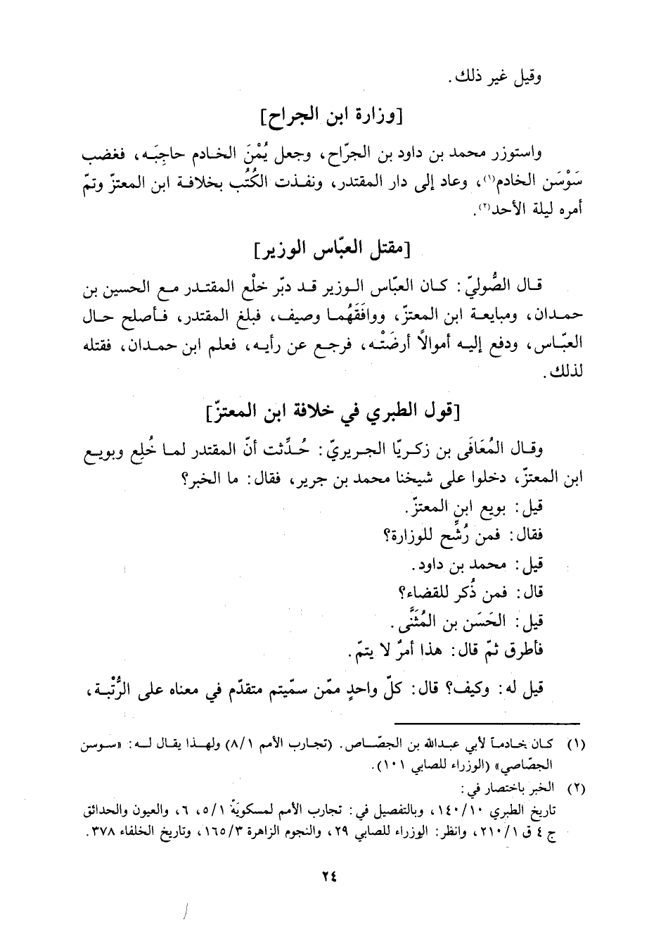 تاريخ الطبري 10/ 140، وبالتفصيل في: تجارب الأمم لمسكويه 1/ 5، 6، والعيون والحدائق ج 4 ق 1/ 210، وانظر: الوزراء للصابي 29، والنجوم الزاهرة 3/ 165، وتاريخ الخلفاء 378.