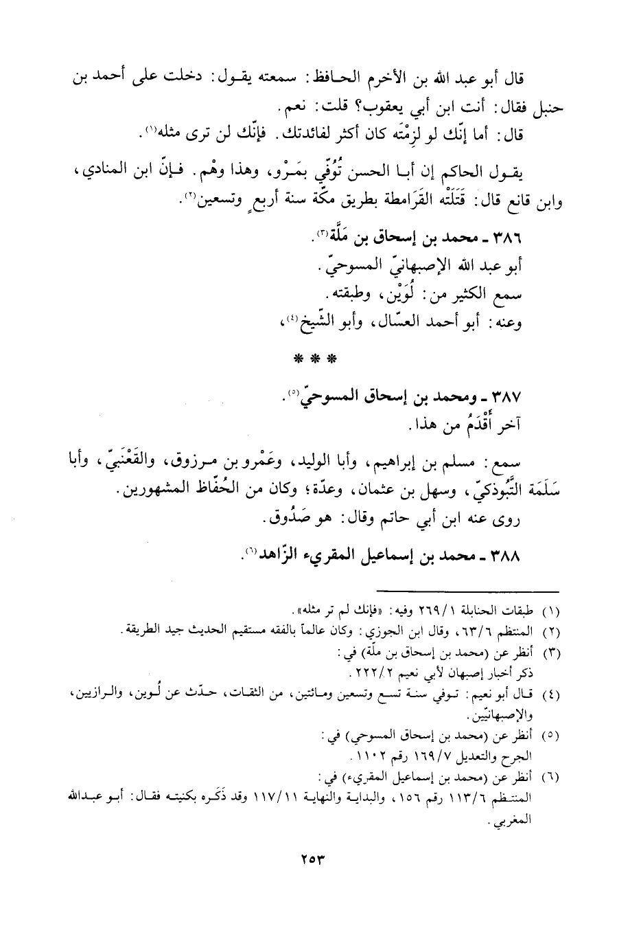 وعنه: أبو أحمد العسال، وأبو الشيخ [4] ، 387- ومحمد بن إسحاق المسوحي [5] .
