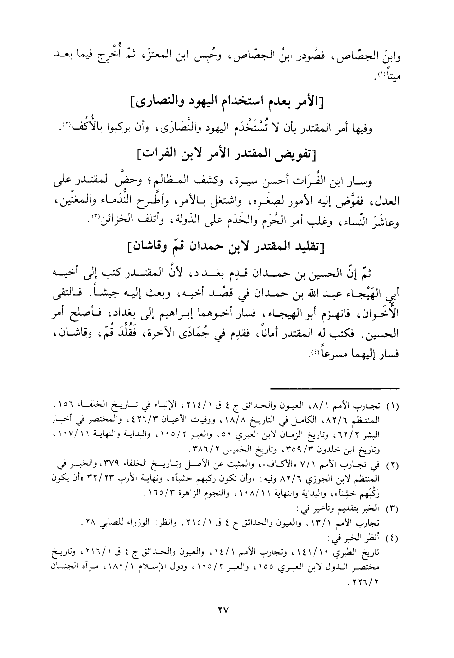 [1] تجارب الأمم 1/ 8، العيون والحدائق ج 4 ق 1/ 214، الإنباء في تاريخ الخلفاء 156، المنتظم 6/ 82، الكامل في التاريخ 8/ 18، ووفيات الأعيان 3/ 426، والمختصر في أخبار البشر 2/ 62، وتاريخ الزمان لابن العبري 50، والعبر 2/ 105، والبداية والنهاية 11/ 107، وتاريخ ابن خلدون 3/ 359، وتاريخ الخميس 2/ 386.