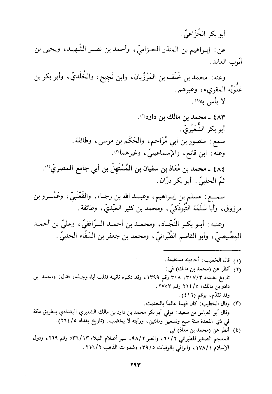 تاريخ بغداد 3/ 307، 308 رقم 1399، وقد ذكره ثانية فقلب أباه وجدّه، فقال: «محمد بن داود بن مالك» 5/ 264 رقم 2753.