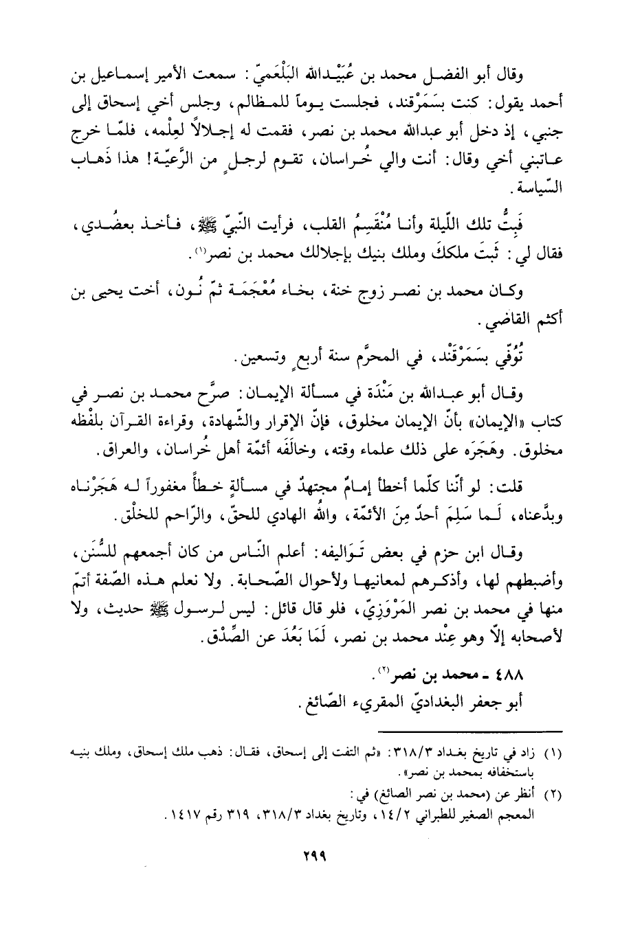 [1] زاد في تاريخ بغداد 3/ 318: «ثم التفت إلى إسحاق، فقال: ذهب ملك إسحاق، وملك بنيه باستخفافه بمحمد بن نصر» .