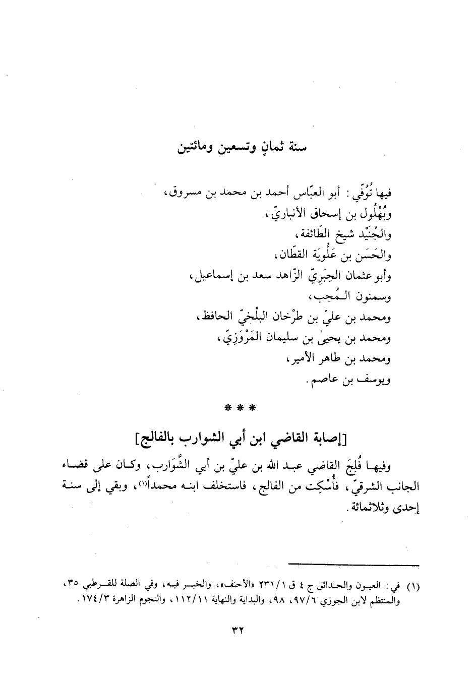 وفيها فُلِجَ القاضي عبد الله بن عليّ بن أبي الشوارب، وكان على قضاء الجانب الشرقيّ، فأُسْكِت من الفالج، فاستخلف ابنه محمدا [1] ، وبقي إلى سنة إحدى وثلاثمائة.
