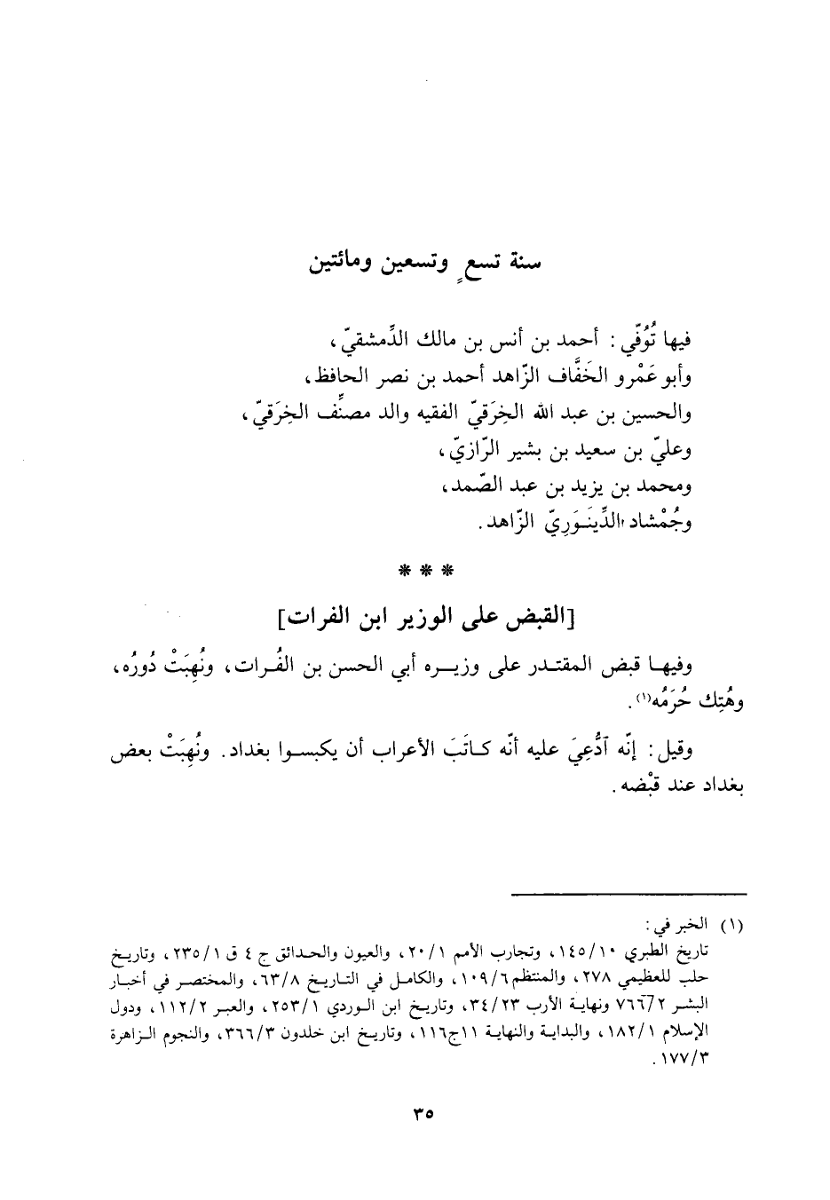 وفيها قبض المقتدر على وزيره أبي الحسن بن الفُرات، ونُهِبَتْ دُورُه، وهُتِك حُرَمُه [1] .