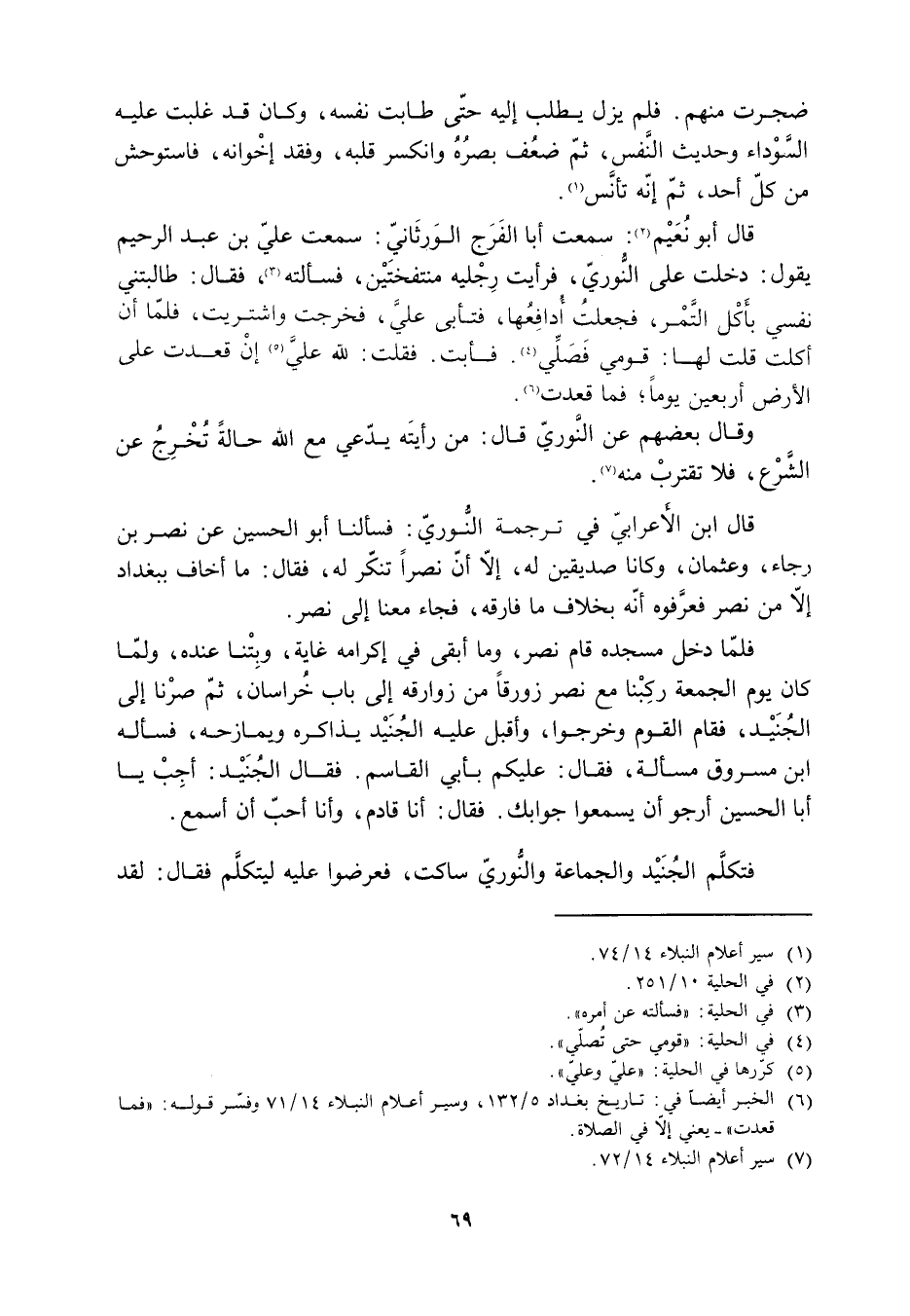 قال أبو نُعَيْم [2] : سمعت أبا الفرج الورثانيّ: سمعت عليّ بن عبد الرحيم يقول: دخلت على النُّوريّ، فرأيت رِجْليه منتفخَتْين، فسألته [3] ، فقال: طالبتني نفسي بأكْل التَّمْر، فجعلتُ أُدافَعُها، فتأبى عليَّ، فخرجت واشتريت، فلمّا أن أكلت قلت لها: قومي فَصَلِّي [4] . فأبت. فقلت: للَّه عليَّ [5] إنْ قعدت على الأرض أربعين يومًا، فما قعدت [6] .