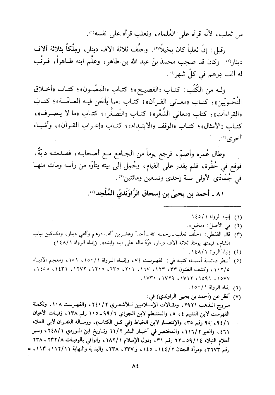 [3] قال القفطي: «خلّف ثعلب- رحمه الله- أحدا وعشرين ألف درهم وألفي دينار، ودكاكين بباب الشام، قيمتها يومئذ ثلاثة آلاف دينار، فردّ ماله على ابنه وابنته» . (إنباه الرواة 1/ 148) .