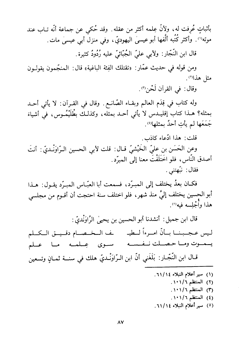 وعن الحسن بن علي الخيشي قال: قلت لأبي الحسين الراوندي: أنت أصدق الناس، فلو اختلفت معنا إلى المبرد.