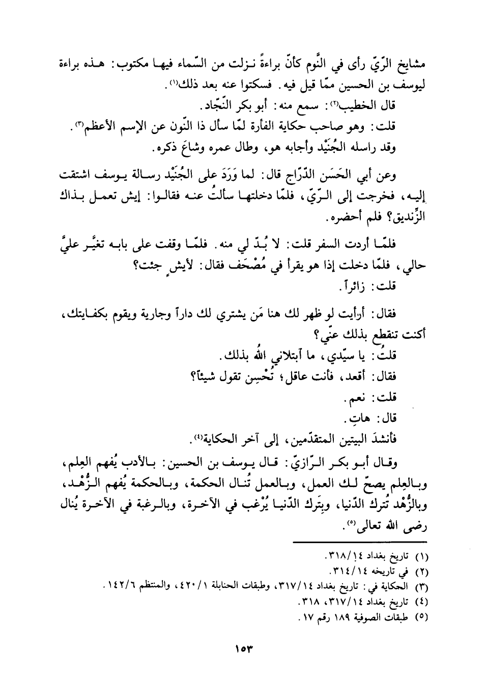 مشايخ الرّيّ رأى في النَّوم كأنّ براءةً نزلت من السّماء فيها مكتوب: هذه براءة ليوسف بن الحسين ممّا قيل فيه. فسكتوا عنه بعد ذلك [1] .