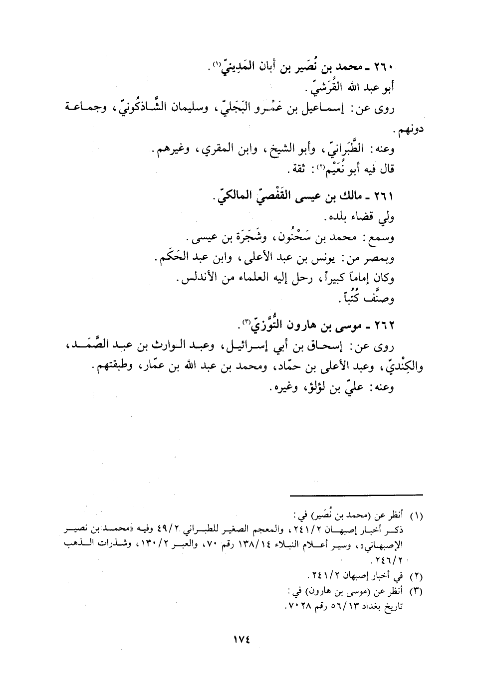 ذكر أخبار أصبهان 2/ 241. والمعجم الصغير للطبراني 2/ 49 وفيه «محمد بن نصير الأصبهاني» ، وسير أعلام النبلاء 14/ 138 رقم 70، والعبر 2/ 130، وشذرات الذهب 2/ 246.