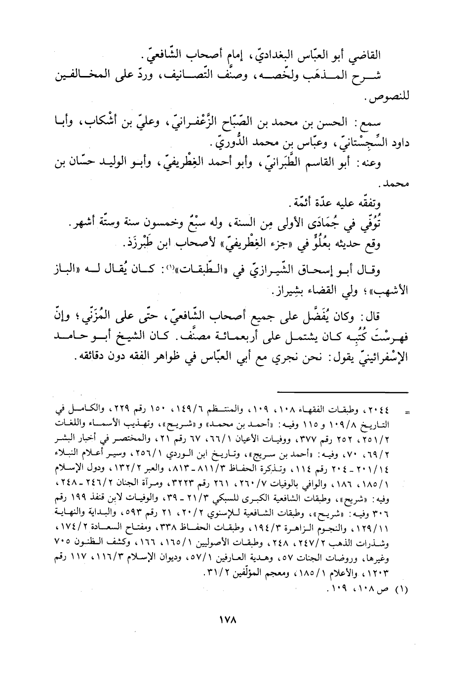 [ () ] 2044، وطبقات الفقهاء 108، 109، والمنتظم 6/ 149، 150 رقم 229، والكامل في التاريخ 8/ 109 و 115 وفيه: «أحمد بن محمد» و «شريح» ، وتهذيب الأسماء واللغات 2/ 251، 252 رقم 377، ووفيات الأعيان 1/ 66، 67 رقم 21، والمختصر في أخبار البشر 2/ 69، 70، وفيه: «أحمد بن سريج» ، وتاريخ ابن الوردي 1/ 256، وسير أعلام النبلاء 14/ 201- 204 رقم 114، وتذكرة الحفاظ 3/ 811- 813، والعبر 2/ 132، ودول الإسلام 1/ 185، 186، والوافي بالوفيات 7/ 260، 261 رقم 3223، ومرآة الجنان 2/ 246- 248، وفيه: «شريح» ، وطبقات الشافعية الكبرى للسبكي 3/ 21- 39، والوفيات لابن قنفذ 199 رقم 306 وفيه: «شريح» ، وطبقات الشافعية للإسنويّ 2/ 20، 21 رقم 593، والبداية والنهاية 11/ 129، والنجوم الزاهرة 3/ 194، وطبقات الحفاظ 338، ومفتاح السعادة 2/ 174، وشذرات الذهب 2/ 247، 248، وطبقات الأصوليين 1/ 165، 166، وكشف الظنون 705 وغيرها، وروضات الجنات 57، وهدية العارفين 1/ 57، وديوان الإسلام 3/ 116، 117 رقم 1203، والأعلام 1/ 185، ومعجم المؤلّفين 2/ 31.