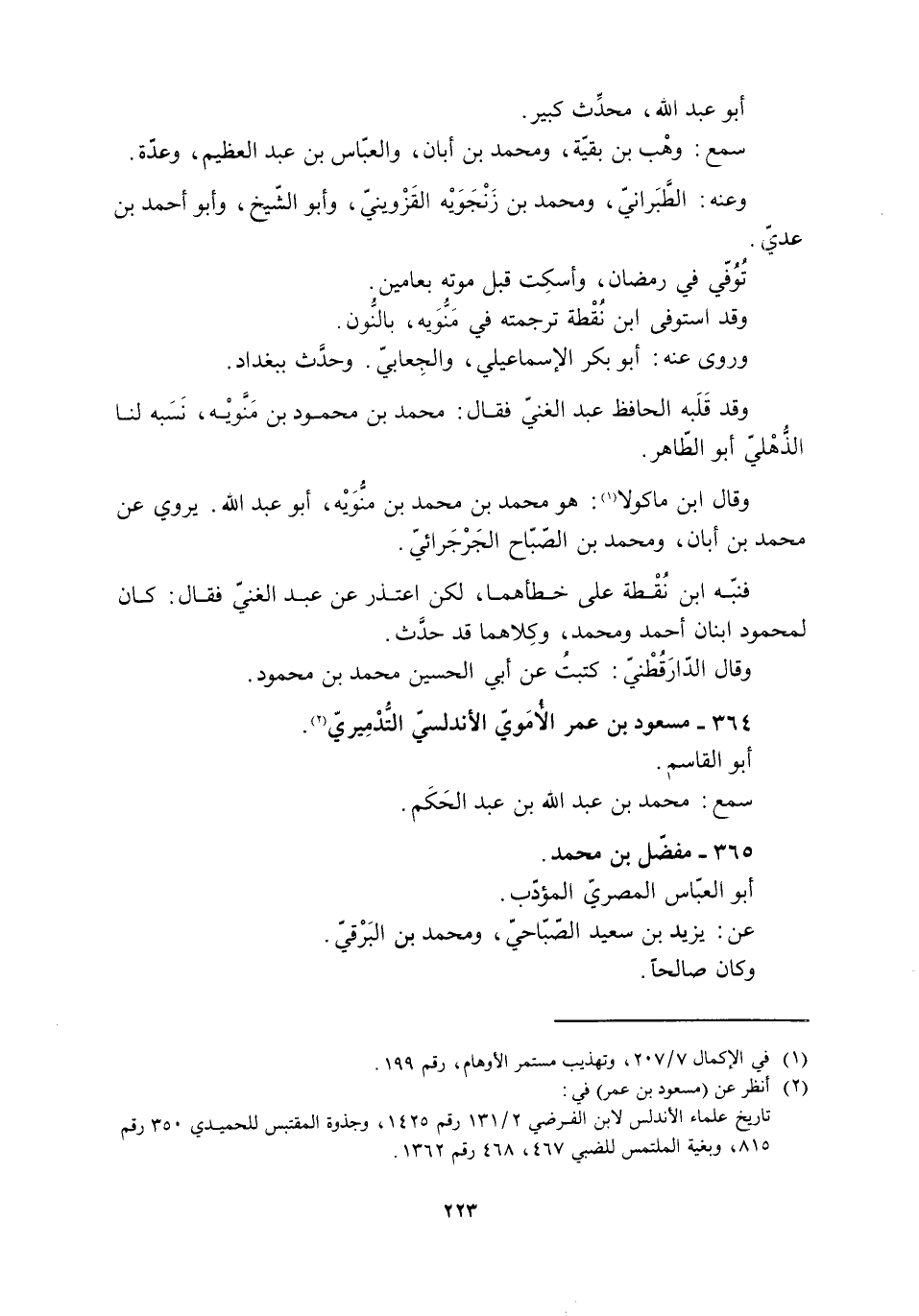 وقال ابن ماكولا [1] : هو محمد بن محمد بن منويه، أبو عبد الله. يروي عن محمد بن أبان، ومحمد بن الصّبّاح الجرجرائيّ.