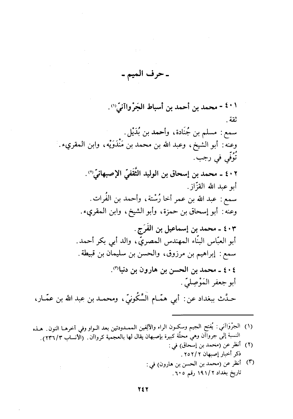 [1] الجرواءانيّ: يفتح الجيم وسكون الراء والألفين الممدودتين بعد الواو وفي آخرها النون. هذه النسبة إلى جرواآن وهي محلّة كبيرة بأصبهان يقال لها بالعجمية كرواآن. (الأنساب 3/ 236) .