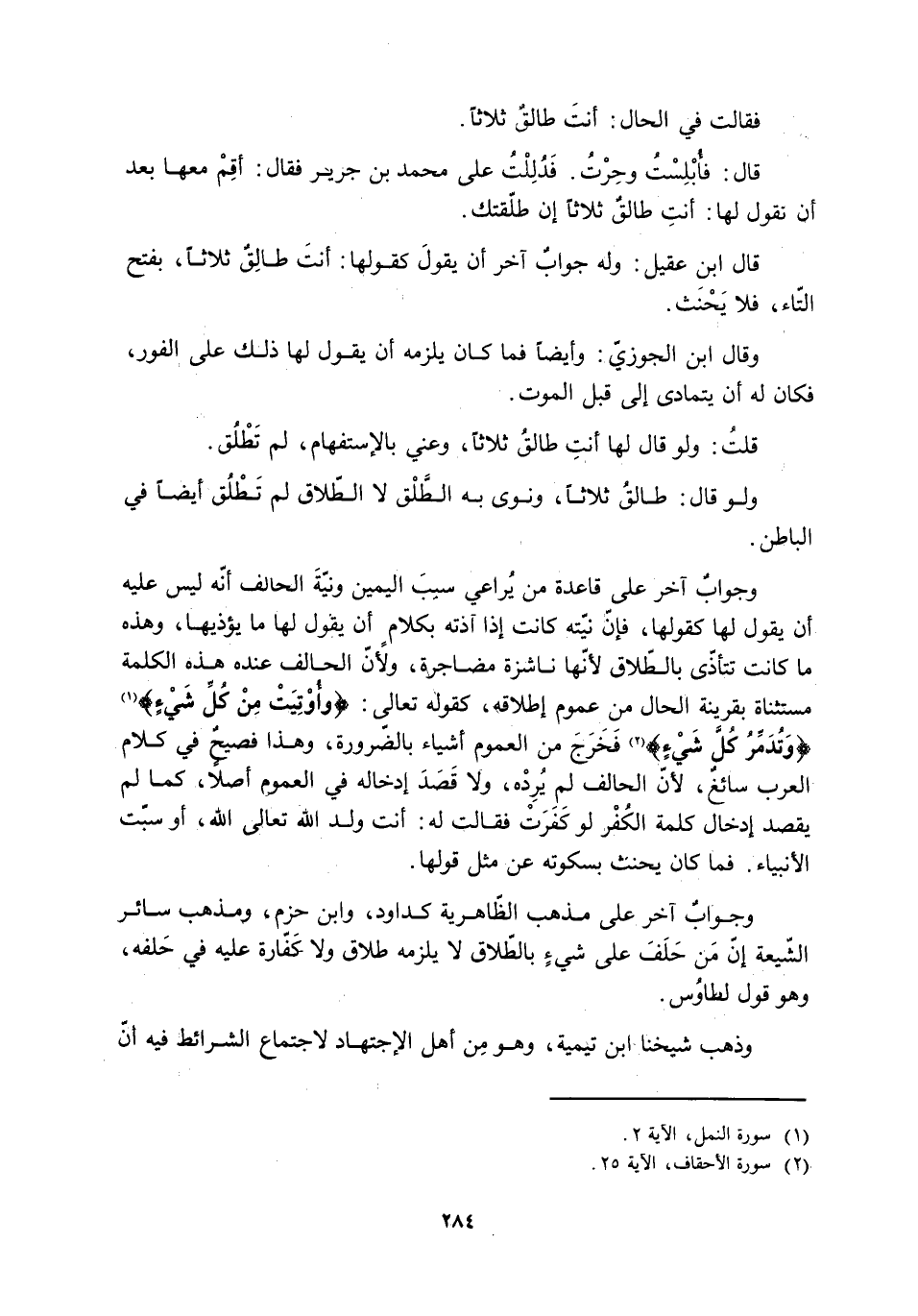وجوابٌ آخر عَلَى قاعدة من يراعي سبب اليمين ونية الحالف أنّه لَيْسَ عَلَيْهِ أنّ يَقُولُ لها كقولها، فإنّ نيّته كانت إذا آذته بكلام أنّ يَقُولُ لها ما يؤذيها، وهذه ما كانت تتأذى بالطلاق لأنها ناشزة مضاجرة، ولأنّ الحالف عنده هذه الكلمة مستثناه بقرينة الحال من عموم إطلاقه، كقوله تعالى: وَأُوتِيَتْ مِنْ كُلِّ شَيْءٍ 27: 23 [1] وتُدَمِّرُ كُلَّ شَيْءٍ 46: 25 [2] فخرج من العموم أشياء بالضرورة، وهذا فصيح في كلام العرب سائغ، لأنه الحالف لم يرده، ولا قصد إدخاله في العموم أصلًا، كما لم يقصد إدخال كلمة الكفر لو كفرت فقالت لَهُ: أنت ولد اللَّه تعالى اللَّه، أو سبّت الأنبياء. فما كَانَ يحنث بسكوته عَنْ مثل قولها.