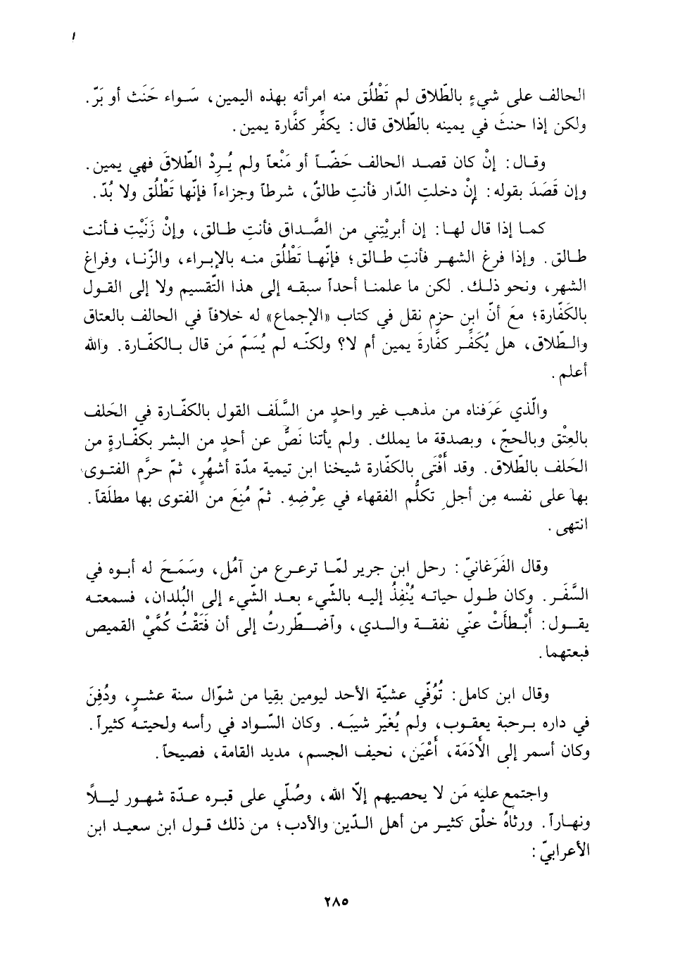 والذي عرفناه من مذهب غير واحد من السلف القول بالكفّارة في الحلف بالعتق وبالحجّ، وبصدقة ما يملك. ولم يأتنا نص عَنْ أحدٍ من البشر بكفارة من الحلف بالطلاق. وقد أفتى بالكفارة شيخنا ابن تيمية مدّة أشهر، ثمّ حرَّم الفتوى بها عَلَى نفسه من أجل تكلم الفُقَهاء في عرضه. ثم منع من الفتوى بها مطلقًا.