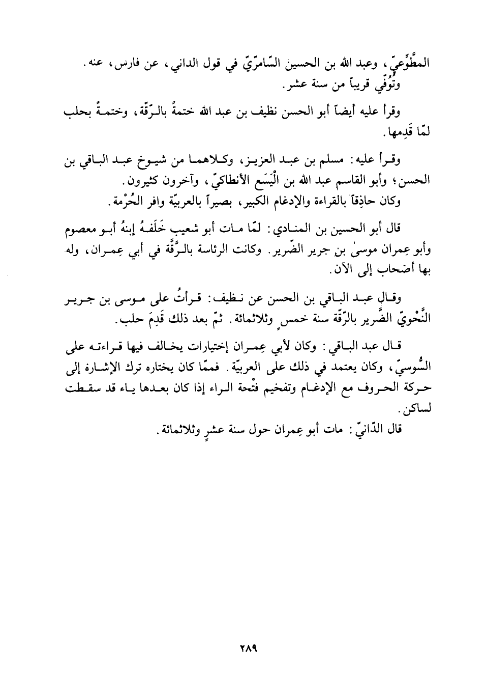 المطَّوِّعيّ، وعَبْد اللَّه بْن الحسين السّامّريّ في قول الداني، عَنْ فارس، عَنْهُ.