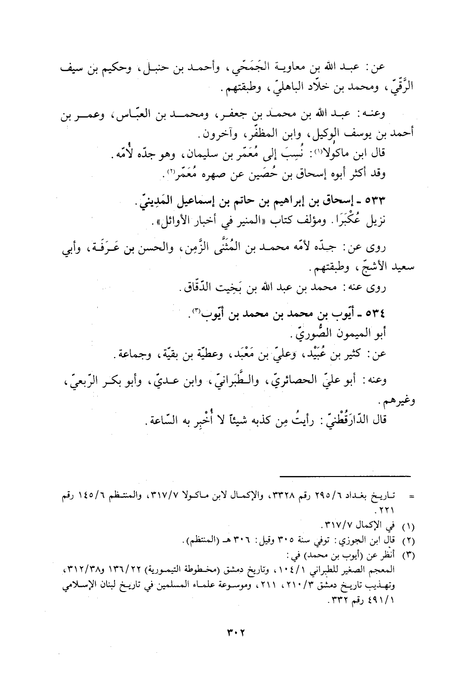 [ () ] تاريخ بغداد 6/ 295 رقم 3328، والإكمال لابن ماكولا 7/ 317، والمنتظم 6/ 145 رقم 221.