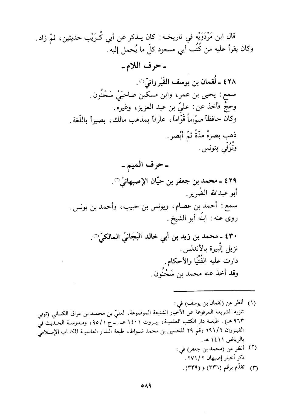 تنزيه الشريعة المرفوعة عن الأخبار الشنيعة الموضوعة، لعليّ بن محمد بن عراق الكناني (توفي 963 هـ) . طبعة دار الكتب العلمية، بيروت 1401 هـ. - ج 1/ 95، ومدرسة الحديث في القيروان 2/ 691 رقم 29 للحسين بن محمد شواط، طبعة الدار العالمية للكتاب الإسلامي بالرياض 1411 هـ.