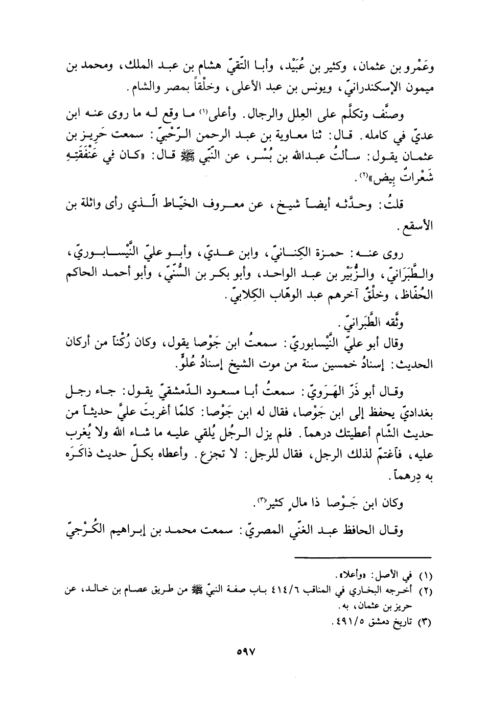 وَصَنَّفَ وَتَكَلَّمَ عَلَى الْعِلَلِ وَالرِّجَالِ. وَأَعْلَى [1] مَا وَقَعَ لَهُ مَا رَوَى عَنْهُ ابْنُ عَدِيٍّ فِي كَامِلِهِ. قَالَ: ثَنَا مُعَاوِيَةُ بْنُ عَبْدِ الرَّحْمَنِ الرَّحَبِيُّ: سَمِعْتُ حَرِيزَ بْنَ عُثْمَانَ يَقُولُ: سَأَلْتُ عَبْدَ اللَّهِ بْنَ بُسْرٍ، عَنِ النَّبِيِّ صَلَّى اللَّهُ عَلَيْهِ وَسَلَّمَ قَالَ: «كَانَ فِي عَنْفَقَتِهِ شَعْرَاتٌ بِيضٌ» [2] . قُلْتُ: وَحَدَّثَهُ أَيْضًا شَيْخٌ، عَنْ مَعْرُوفٍ الْخَيَّاطِ الَّذِي رَأَى وَاثِلَةَ بْنَ الْأَسْقَعِ.