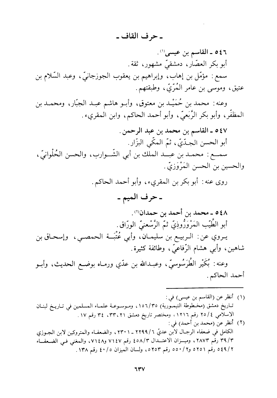 تاريخ دمشق (مخطوطة التيمورية) 35/ 156، وموسوعة علماء المسلمين في تاريخ لبنان الإسلامي 4/ 25 رقم 1216، ومختصر تاريخ دمشق 21، 33، 34 رقم 17.