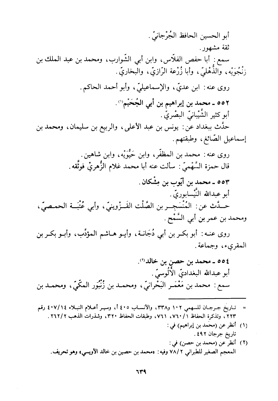[ () ] تاريخ جرجان للسهمي 102 و 338، والأنساب 405 أ، وسير أعلام النبلاء 14/ 407 رقم 223، وتذكرة الحفاظ 1/ 760، 761، وطبقات الحفاظ 320، وشذرات الذهب 2/ 262.