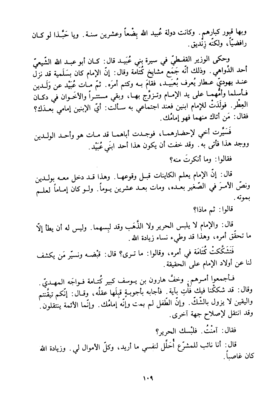 قال: إنّ الإمام يعلم الكائنات قبل وقوعها. وهذا قد دخل معه بولدين ونص الأمر في الصغير بعده، ومات بعد عشرين يومًا. ولو كان إماما لعلم بموته.