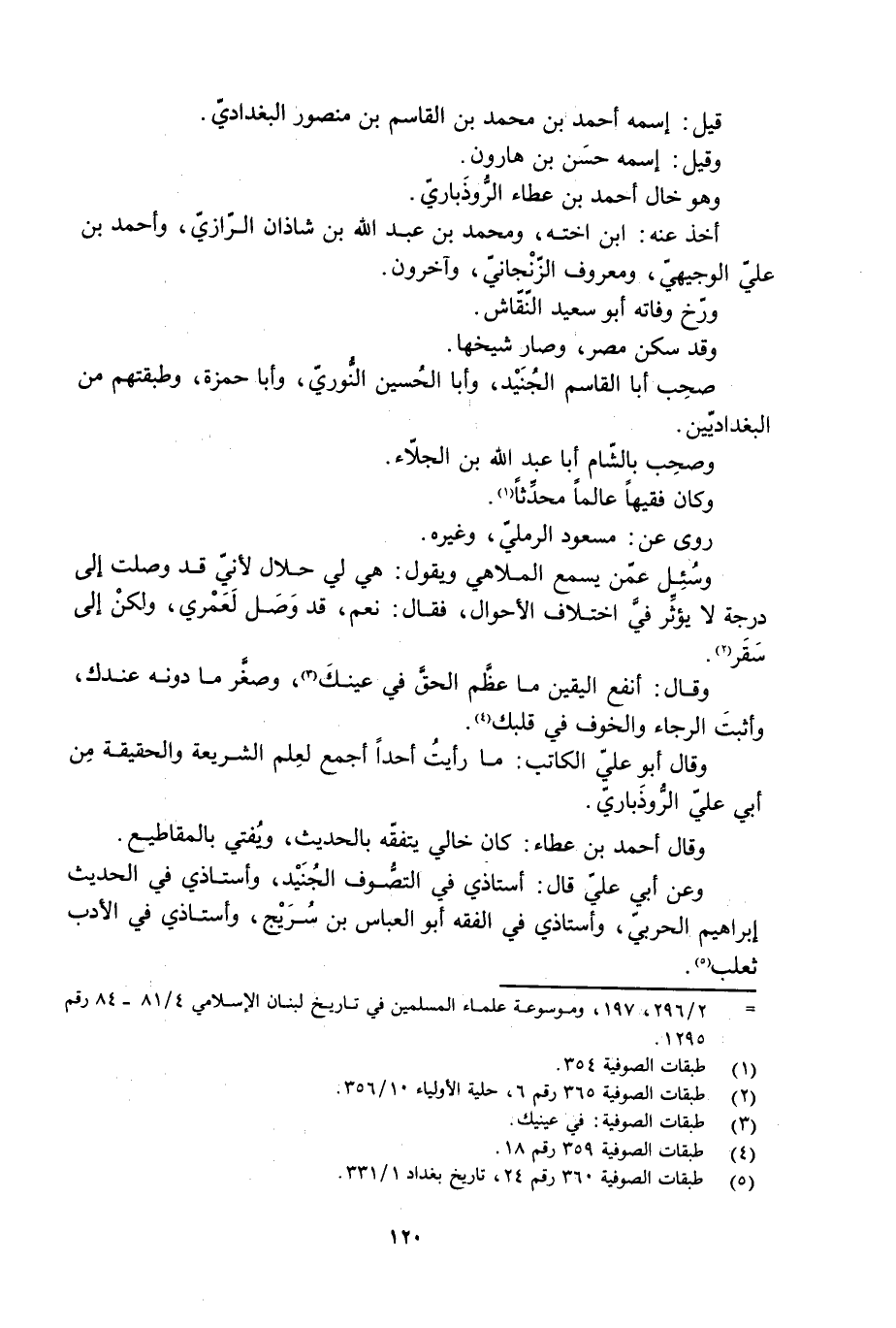 [5] طبقات الصوفية 360 رقم 24، تاريخ بغداد 1/ 331.