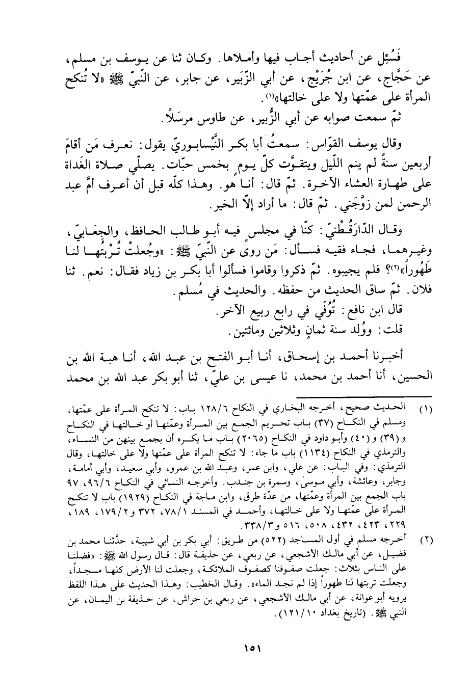 فَسُئِلَ عَنْ أَحَادِيثَ أَجَابَ فِيهَا وَأَمْلَاهَا. وَكَانَ ثَنَا عَنْ يُوسُفَ بْنِ مُسْلِمٍ، عَنْ حَجَّاجٍ، عَنِ ابْنِ جُرَيْجٍ، عَنْ أَبِي الزُّبَيْرِ، عَنْ جَابِرٍ، عَنِ النَّبِيِّ صَلَّى اللَّهُ عَلَيْهِ وَسَلَّمَ «لَا تُنْكَحُ الْمَرْأَةُ عَلَى عَمَّتِهَا وَلَا عَلَى خَالَتِهَا» [1] .
