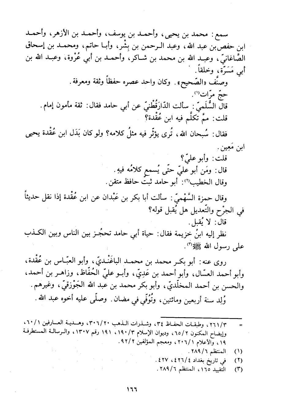 فقال: سبُحان الله، تُرى يؤثّر فيه مثلُ كلامه؟ ولو كان بَدَل ابن عُقْدة يحيى ابن مَعِين.
