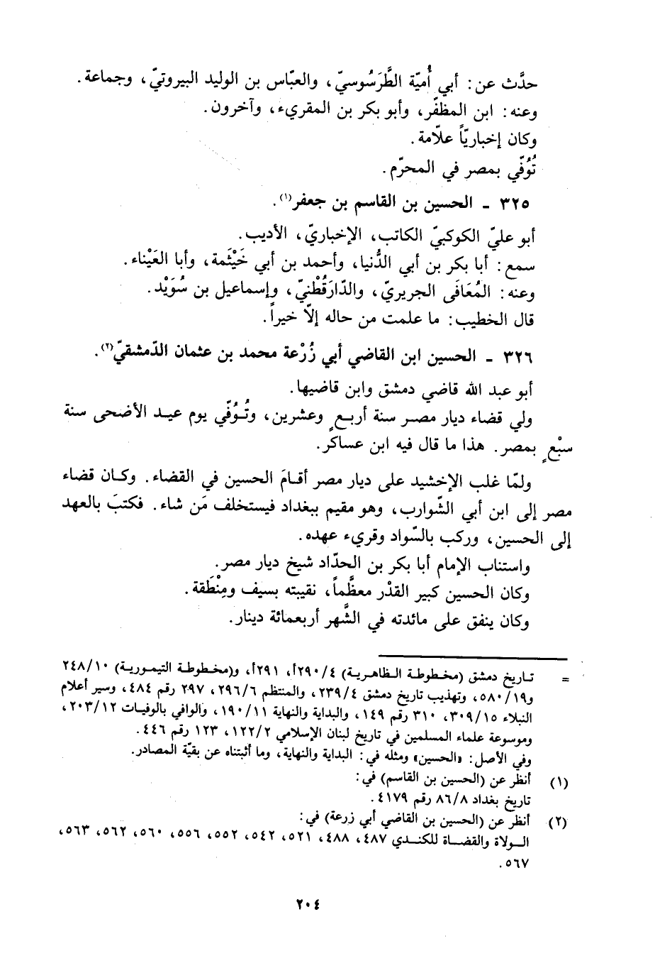 326- الحسين ابن القاضي أبي زُرْعة محمد بن عثمانٍ الدّمشقيّ [2] أبو عبد الله قاضي دمشق وابن قاضيها.