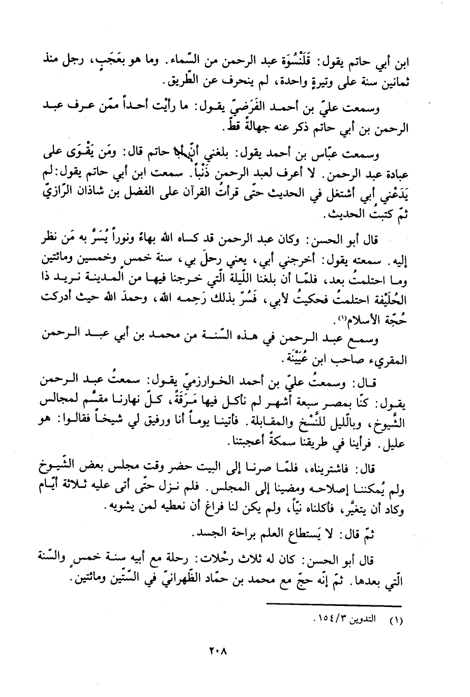 قال أبو الحسن: وكان عبد الرحمن قد كساه الله بهاء ونورا يسرّ به من نظر إليه. سمعته يقول: أخرجني أبي، يعني رحلَ بي، سنة خمس وخمسين ومائتين وما احتلمت بعد، فلمّا أن بلغنا الليلة الّتي خرجنا فيها من المدينة نريد ذا الحلَيْفة احتلمتُ فحكيتُ لأبي، فَسُرّ بذلك رحمه الله، وحمدَ الله حيث أدركت حُجّة الإسلام [1] .