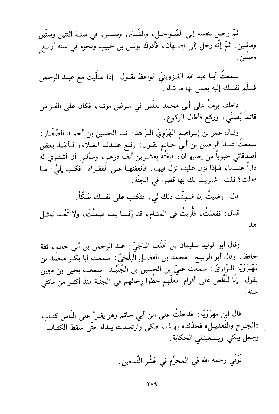 قال ابن مهرويه: فدخلت على ابن أبي حاتم وهو يقرأ على النّاس كتاب «الجرح والتعديل» فحدثته بهذا، فبكى وارتعدت يداه حتّى سقط الكتاب.
