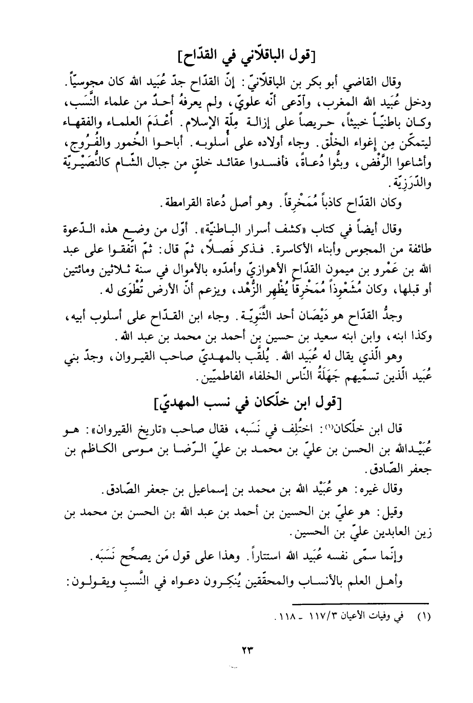 وقال القاضي أبو بكر بن الباقلّانيّ: إنّ القدّاح جدّ عُبَيْد الله كان مجوسيًّا.