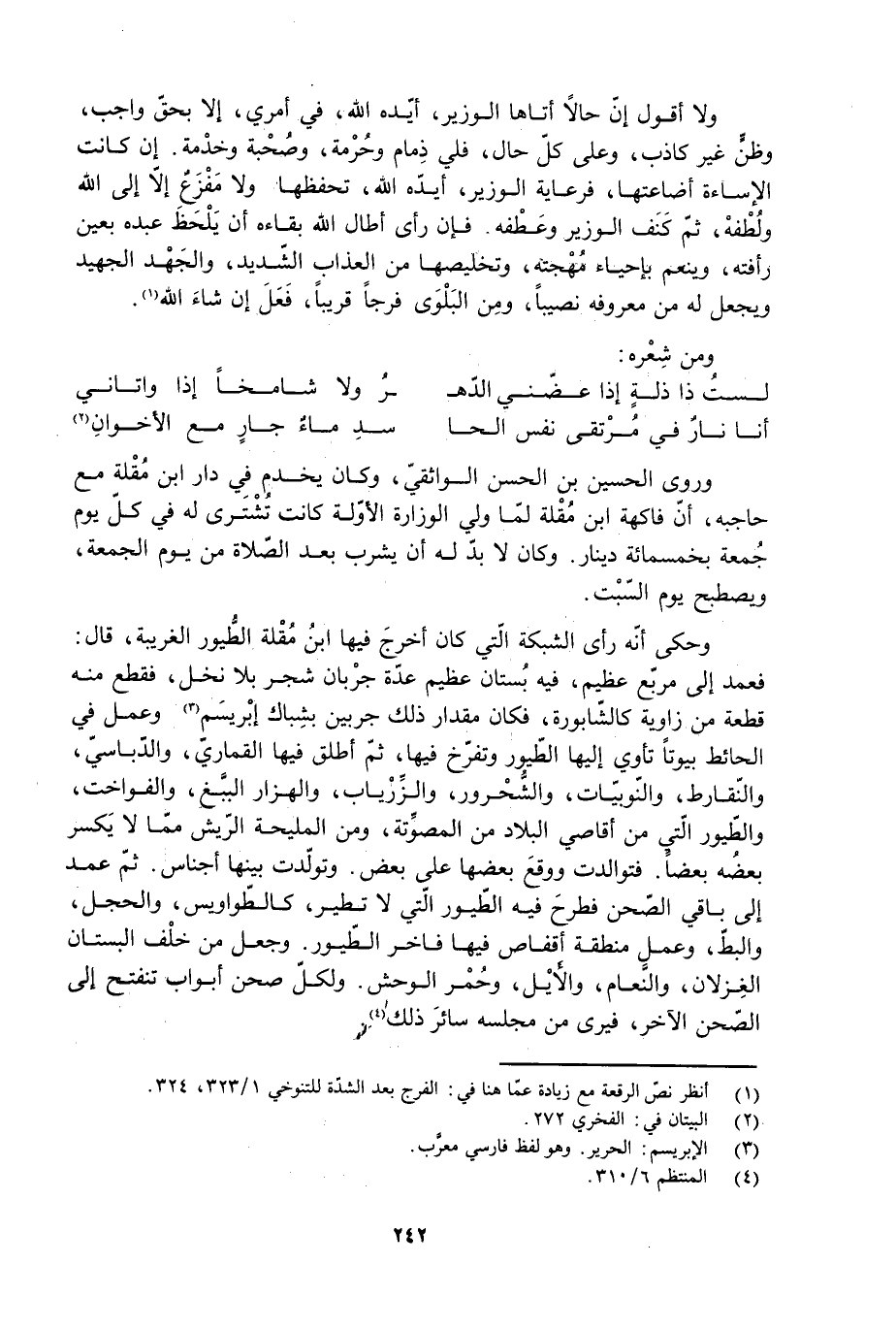 فعمد إلى مربع عظيم، فيه بستان عظيم عدّة جرْبان شجر بلا نخل، فقطع منه قطعة من زاوية كالشّابورة، فكان مقدار ذلك جربين بشِباك إبْريسَم [3] وعمل في الحائط بيوتًا تأوي إليها الطيور وتفرخ فيها، ثمّ أطلق فيها القماريّ، والدّباسيّ، والنقارط، والنوبيات، والشُّحْرور، والزِّرْياب، والهزار الببَّغ، والفواخت، والطيور التي من أقاصي البلاد من المصوتة، ومن المليحة الرّيش ممّا لا يَكسر بعضه بعضًا. فتوالدت ووقعَ بعضها على بعض. وتولدت بينها أجناس. ثمّ عمد إلى باقي الصحن فطرحَ فيه الطيور التي لا تطير، كالطواويس، والحجل، والبط، وعمل منطقة أقفاص فيها فاخر الطيور. وجعل من خلف البستان الغزلان، والنَّعام، والأَيْل، وحُمْر الوحش. ولكلّ صحن أبواب تنفتح إلى الصحن الآخر، فيرى من مجلسه سائر ذلك [4] .
