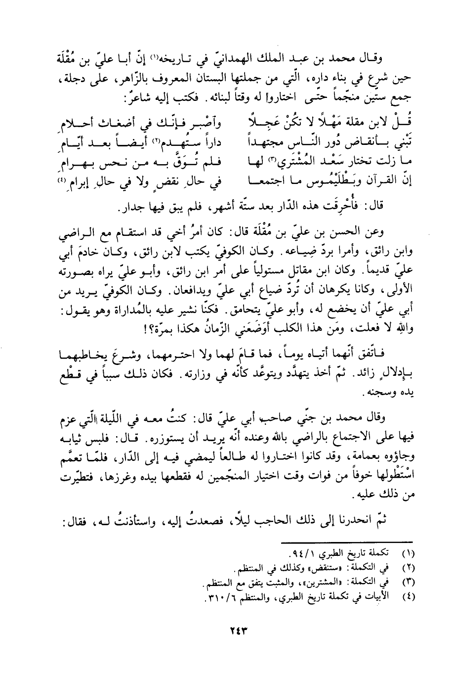 [4] الأبيات في تكملة تاريخ الطبري، والمنتظم 6/ 310.