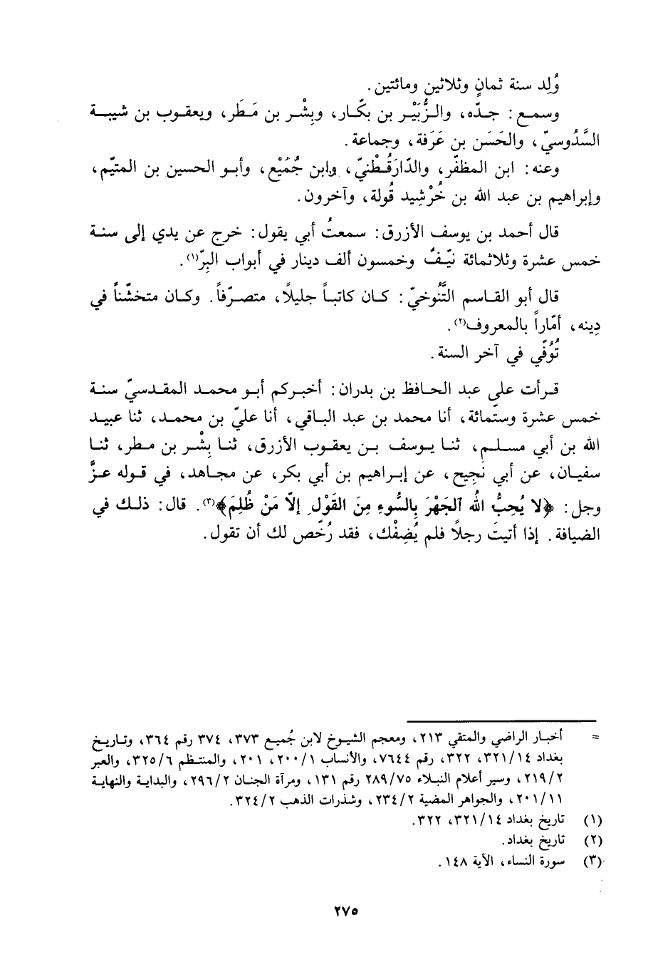 [ () ] أخبار الراضي والمتقي 213، ومعجم الشيوخ لابن جميع 373، 374 رقم 364، وتاريخ بغداد 14/ 321، 322، رقم 7644، والأنساب 1/ 200، 201، والمنتظم 6/ 325، والعبر 2/ 219، وسير أعلام النبلاء 75/ 289 رقم 131، ومرآة الجنان 2/ 296، والبداية والنهاية 11/ 201، والجواهر المضية 2/ 234، وشذرات الذهب 2/ 324.
