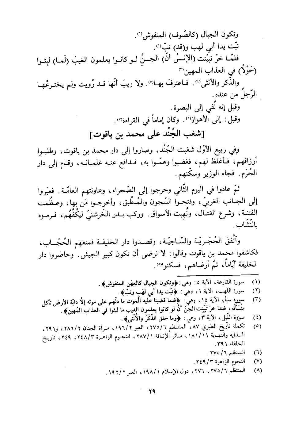 [5] تكملة تاريخ الطبري 87، المنتظم 6/ 275، العبر 2/ 196، مرآة الجنان 2/ 286، و 291، البداية والنهاية 11/ 181، مآثر الإنافة 1/ 287، النجوم الزاهرة 3/ 248، 249، تاريخ الخلفاء 391.