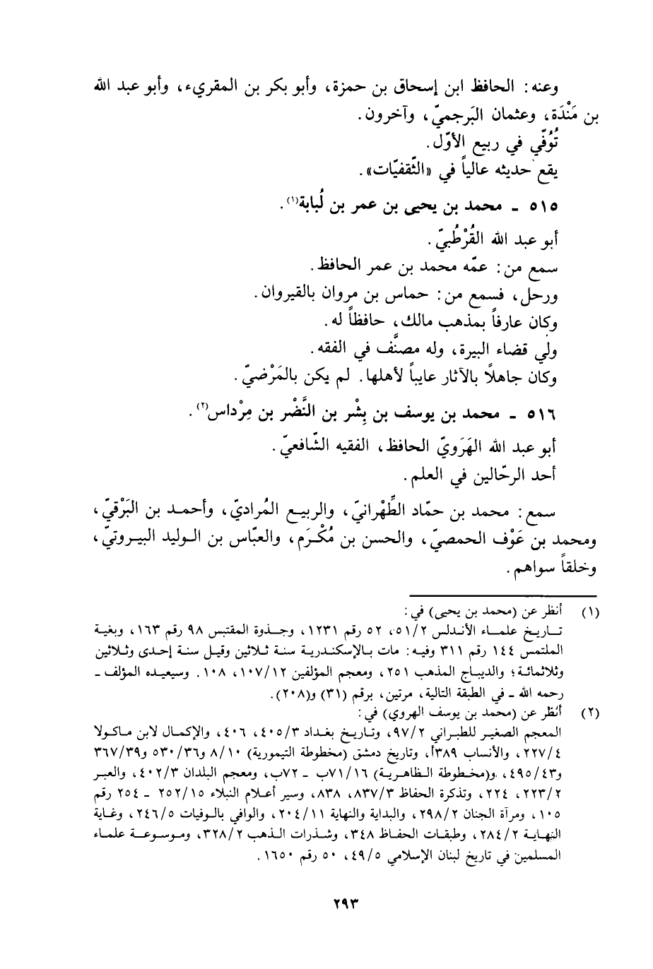 تاريخ علماء الأندلس 2/ 51، 52 رقم 1231، وجذوة المقتبس 98 رقم 163، وبغية الملتمس 144 رقم 311 وفيه: مات بالإسكندرية سنة ثلاثين وقيل سنة إحدى وثلاثين وثلاثمائة، والديباج المذهب 251، ومعجم المؤلفين 12/ 107، 108. وسيعيده المؤلف- رحمه الله- في الطبقة التالية، مرتين، برقم (31) و (208) .