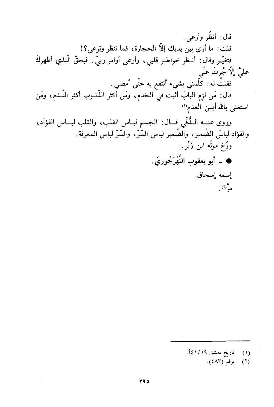 وروى عنه الدُّقيّ قال: الجسم لباس القلب، والقلب لباس الفؤاد، والفؤاد لباس الضمير، والضمير لباس السّرّ، والسّرّ لباس المعرفة.