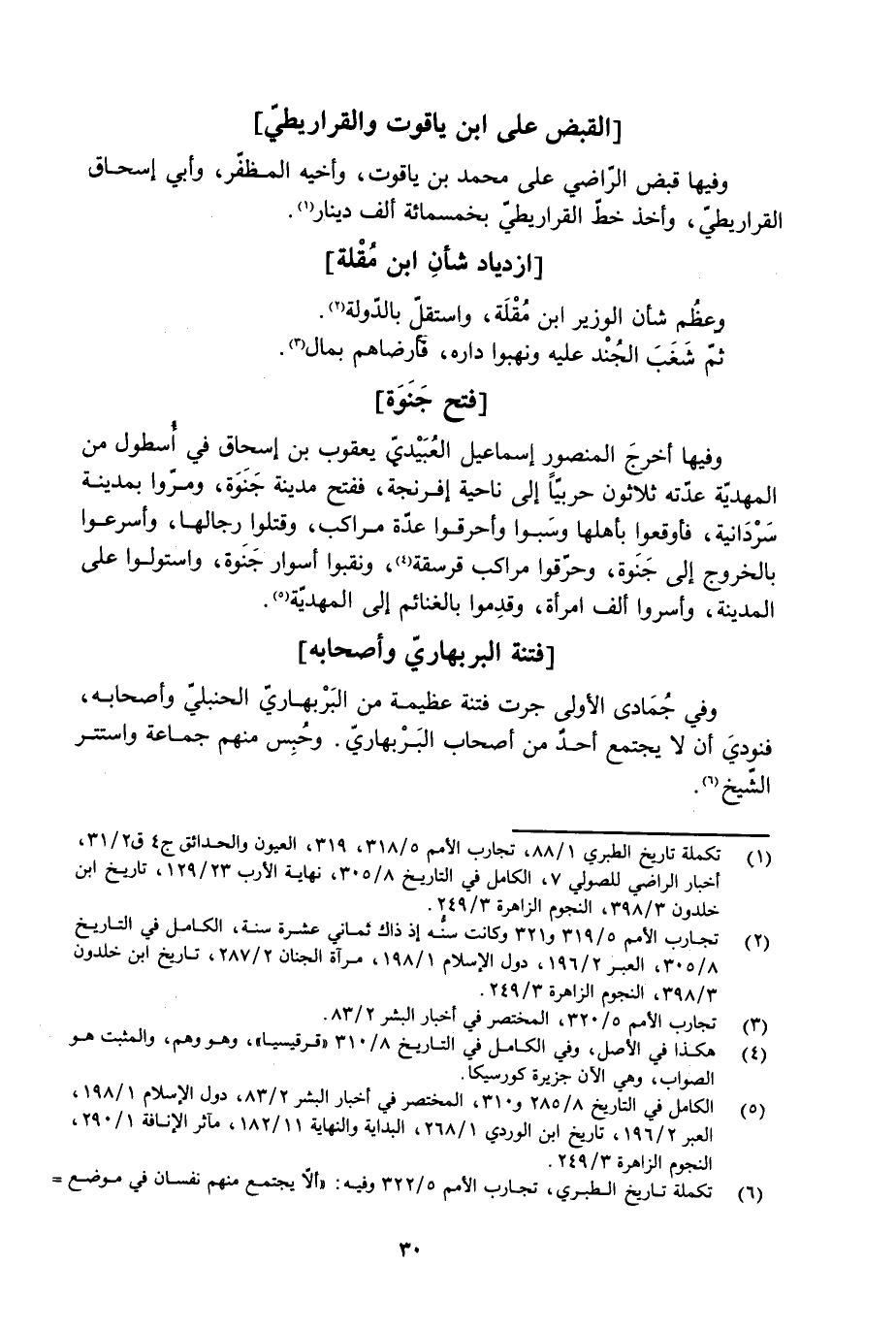 [1] تكملة تاريخ الطبري 1/ 88، تجارب الأمم 5/ 318، 319، العيون والحدائق ج 4 ق 2/ 31، أخبار الراضي للصولي 7، الكامل في التاريخ 8/ 305، نهاية الأرب 23/ 129، تاريخ ابن خلدون 3/ 398، النجوم الزاهرة 3/ 249.