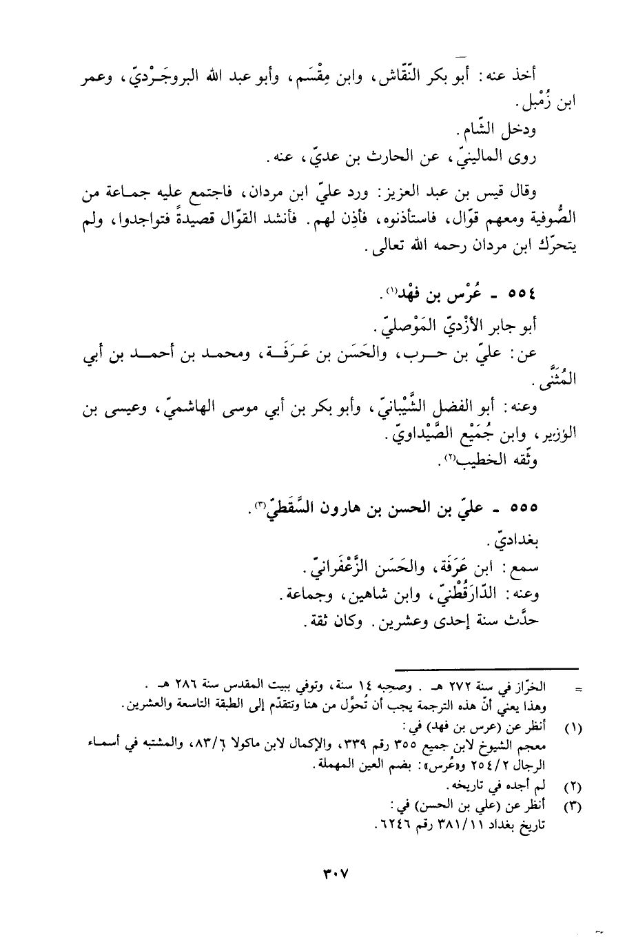 معجم الشيوخ لابن جميع 355 رقم 339، والإكمال لابن ماكولا 6/ 83، والمشتبه في أسماء الرجال 2/ 254 و «عرس» : بضم العين المهملة.