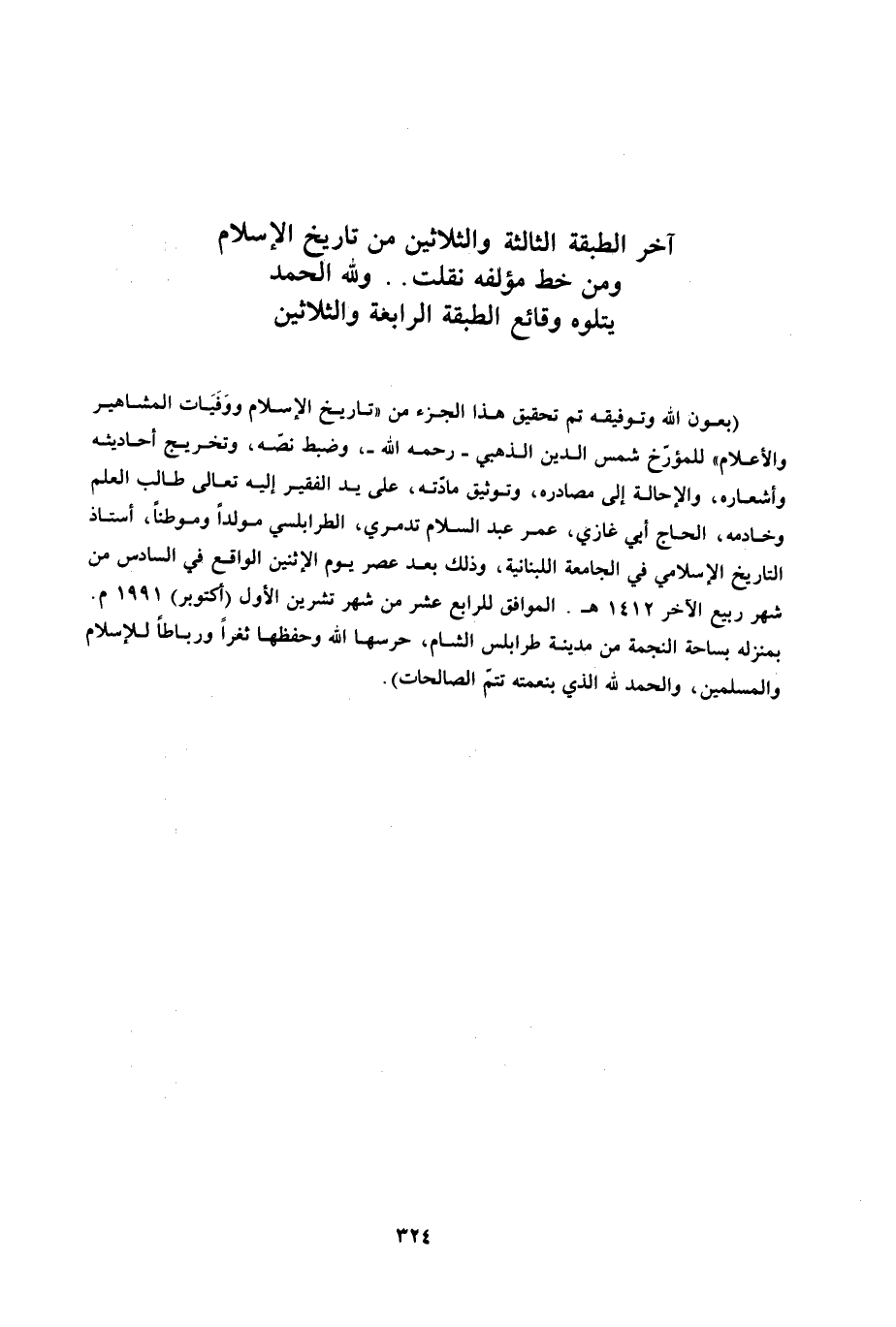 آخر الطبقة الثالثة والثلاثين من تاريخ الإسلام ومن خط مؤلّفه نقلت.. وللَّه الحمد يتلوه وقائع الطبقة الرابعة والثلاثين (بعون الله وتوفيقه تم تحقيق هذا الجزء من «تاريخ الإسلام ووفيات المشاهير والأعلام» للمؤرّخ شمس الدين الذهبي- رحمه الله-، وضبط نصّه، وتخريج أحاديثه وأشعاره، والإحالة إلى مصادره، وتوثيق مادّته، على يد الفقير إليه تعالى طالب العلم وخادمه، الحاج أبي غازي، عمر عبد السلام تدمري، الطرابلسي مولدا وموطنا، أستاذ التاريخ الإسلامي في الجامعة اللبنانية، وذلك بعد عصر يوم الاثنين الواقع في السادس من شهر ربيع الآخر 1412 هـ. الموافق للرابع عشر من شهر تشرين الأول (أكتوبر) 1991 م.