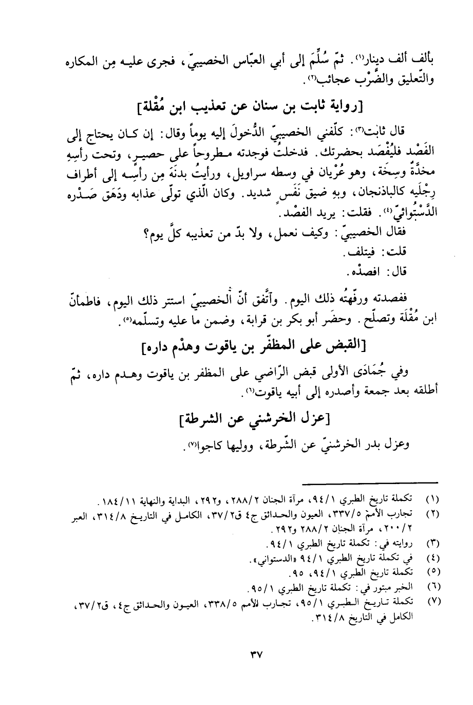 [7] تكملة تاريخ الطبري 1/ 95، تجارب الأمم 5/ 338، العيون والحدائق ج 4، ق 2/ 37، الكامل في التاريخ 8/ 314.