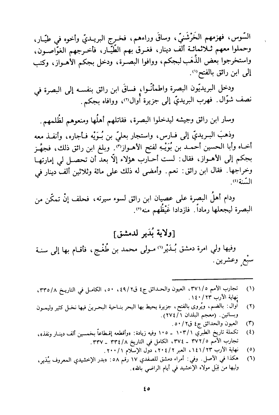 [6] هكذا في الأصل. وفي: أمراء دمشق للصفدي 17 رقم 58: «بدر الإخشيدي المعروف ببدير، وليها من قبل مولاه الإخشيد في أيام الراضي باللَّه» .