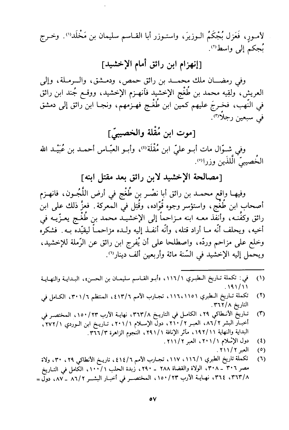 [2] تكملة تاريخ الطبري 1/ 115، 116، تجارب الأمم 6/ 413، المنتظم 6/ 301، الكامل في التاريخ 8/ 362.