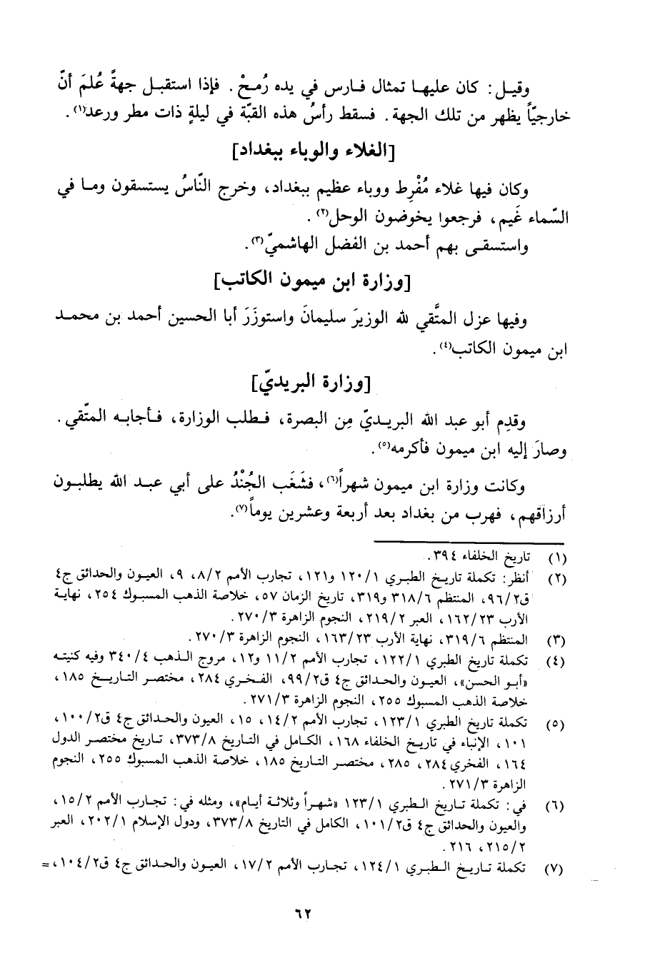 [7] تكملة تاريخ الطبري 1/ 124، تجارب الأمم 2/ 17، العيون والحدائق ج 4 ق 2/ 104،