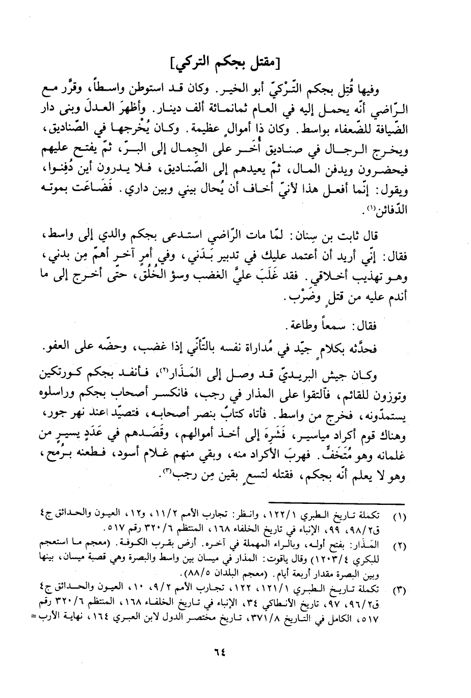 [3] تكملة تاريخ الطبري 1/ 121، 122، تجارب الأمم 2/ 9، 10، العيون والحدائق ج 4 ق 2/ 96، 97، تاريخ الأنطاكي 34، الإنباء في تاريخ الخلفاء 168، المنتظم 6/ 320 رقم 517، الكامل في التاريخ 8/ 371، تاريخ مختصر الدول لابن العبري 164، نهاية الأرب