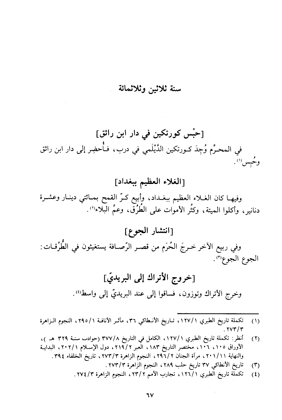 [2] انظر: تكملة تاريخ الطبري 1/ 127، الكامل في التاريخ 8/ 377 (حوادث سنة 329 هـ) ، الأوراق 105، 106، مختصر التاريخ 183، العبر 2/ 219، دول الإسلام 1/ 202، البداية والنهاية 11/ 201، مرآة الجنان 2/ 296، النجوم الزاهرة 3/ 273، تاريخ الخلفاء 394.